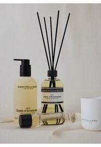 - Fragrance Sticks Objets d'Amsterdam 250ml: Linalyl acetate ; Linalool ; alpha-Hexylcinnamaldehyde ; dl-Limonene ; Geraniol ; 1-(1,2,3,4,5,6,7,8-Octahydro-2,3,8,8-tetramethyl-2-naphtyl)ethan-1-one ; Citronellol ; Nerol ; 2,4-Dimethylcyclohex-3-ene-1-carbaldehyde ; Citral ; (-)-Pin-2(3)-ene ; 1-(2,6,6-Trimethyl-1,3-cyclohexadien-1-yl)-2-buten-1-one Body Wash Objets d'Amsterdam 300ml: Aqua, Coco-Glucoside, Sodium Coco-Sulfate, Parfum, Cocamidopropyl Betaine, Glycerin, Lactic Acid, Glyceryl Oleate, Sodium Chloride, Tocopherol, Hydrogenated Palm Glycerides Citrate, Linalool, Hexyl Cinnamal, Limonene, Geraniol, Citronellol, Citral, Sodium Benzoate, Potassium Sorbate, Citric Acid Dry Body Oil Objets d'Amsterdam 50ml: Coco-Caprylate/ Caprate, Dicaprylyl Carbonate, Parfum, Caprylic Capric Triglyceride, Prunus Amygdalus Dulcis Oil, Olus Oil, Laminaria Ochroleuca Extract, Opuntia Ficus-Indica Seed Oil, Tocopherol, Helianthus Annuus Seed Oil, Linalool, Hexyl Cinnamal, Limonene, Geraniol, Citronellol, Citral, Citric Acid Scented Candle Objets d'Amsterdam 100gr: Linalyl Acetate, Linalool, Rose Ketone-4, Hexyl Cinnamal, Citral, Lavandula Hybrida Grosso Herb Oil, Geraniol, Citronellol, Tetramethyl Acetyloctahydronaphthalenes, Limonene, Nerol, Dimethyl-3-Cyclohexene-1-Carbaldehyde