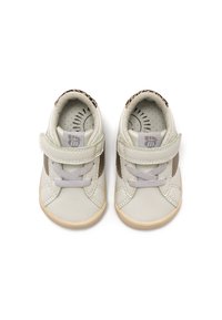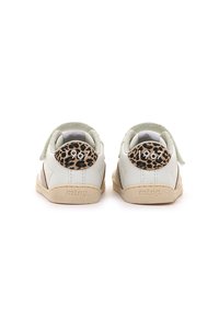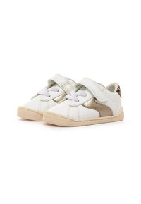 Baskets blanches avec des accents dorés métalliques, imprimé léopard texturé au talon, fermeture à lacets à l'avant, et bride Velcro pour un maintien sécurisé.