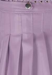 Jupe plissée lavande avec une large ceinture, fabriquée en tissu lisse. La jupe tombe au milieu de la cuisse, présentant une forme symétrique et évasée.