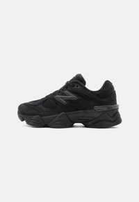 Baskets de sport noires avec un upper en maille et en daim, accents gris, col rembourré et semelle en caoutchouc texturé. Présente un logo bien en évidence.