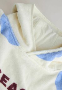 Poncho blanc à capuche sans manches avec des pois bleus et le texte « SEAS THE DAY » en bordeaux sur le devant.