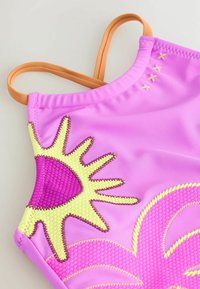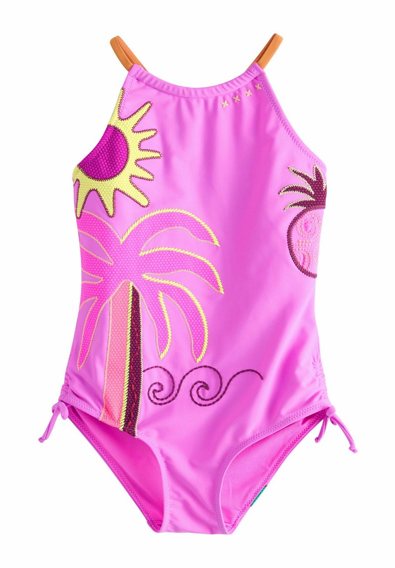 Maillot de bain une pièce rose avec des broderies jaunes représentant un soleil, un palmier et un ananas, avec de fines bretelles orange et des liens sur les côtés.
