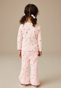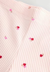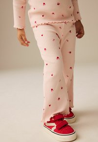 Jeune fille aux cheveux bruns en couettes portant un haut côtelé assorti rose clair et un pantalon avec de petites impressions de fleurs rouges ainsi que des baskets rouges.