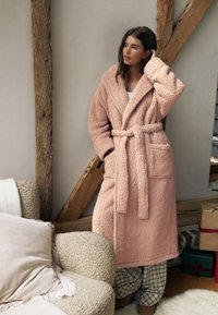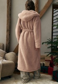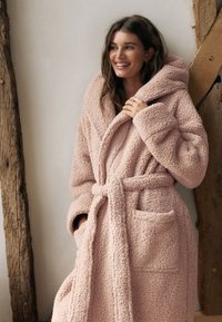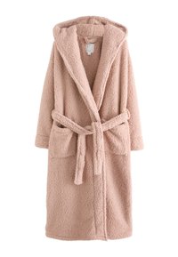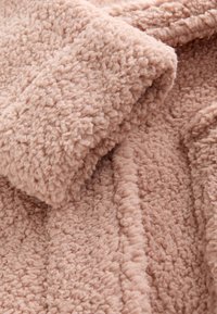 Personne portant un manteau teddy beige texturé avec une ceinture nouée à la taille et les mains dans les poches avant, sur un fond neutre.