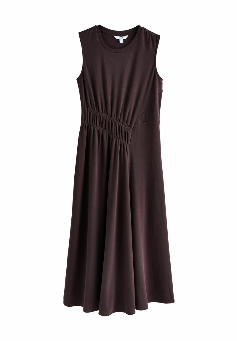 Robe midi sans manches marron foncé avec un décolleté rond et un détail de taille froncée créant un effet drapé asymétrique.
