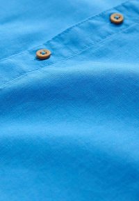 Chemise à manches courtes bleu vif avec boutons en bois et col classique, posée à plat sur un fond blanc.