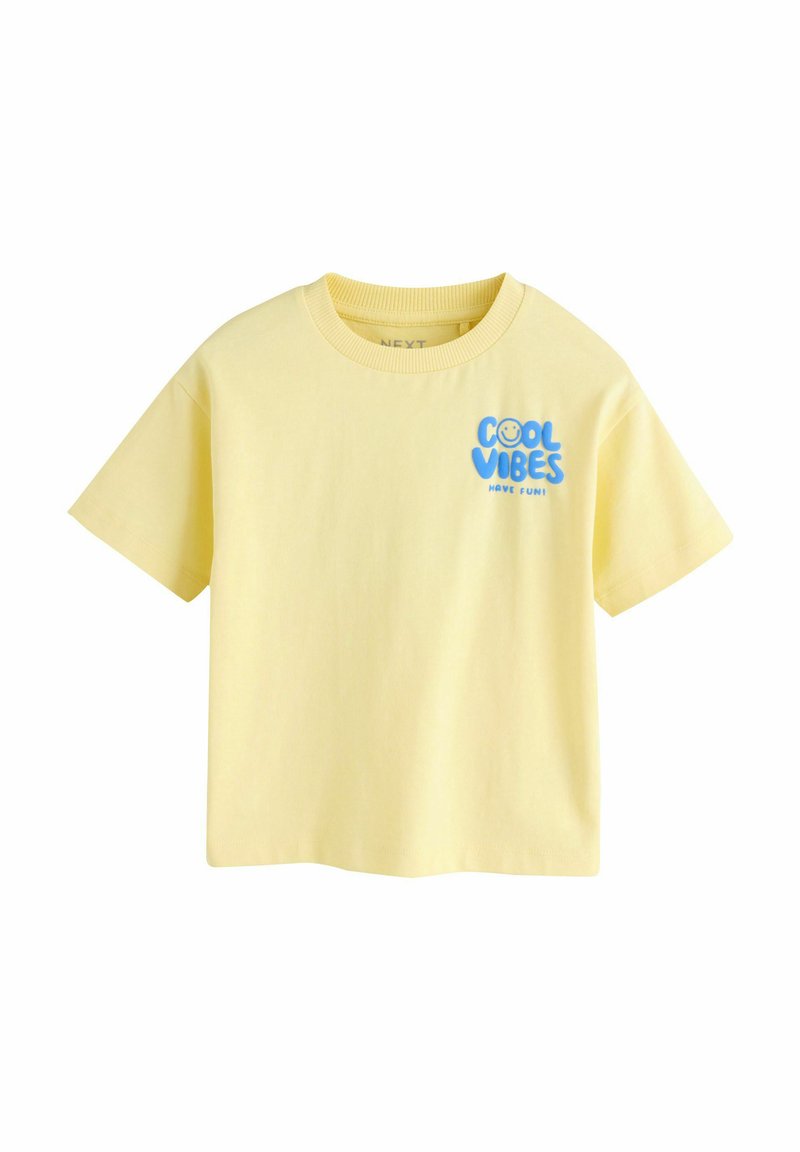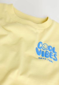 T-shirt jaune à manches courtes avec inscription bleue "COOL VIBES HAVE FUN !" et graphique de visage souriant sur la poitrine gauche.