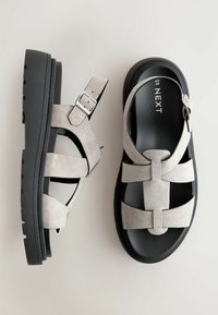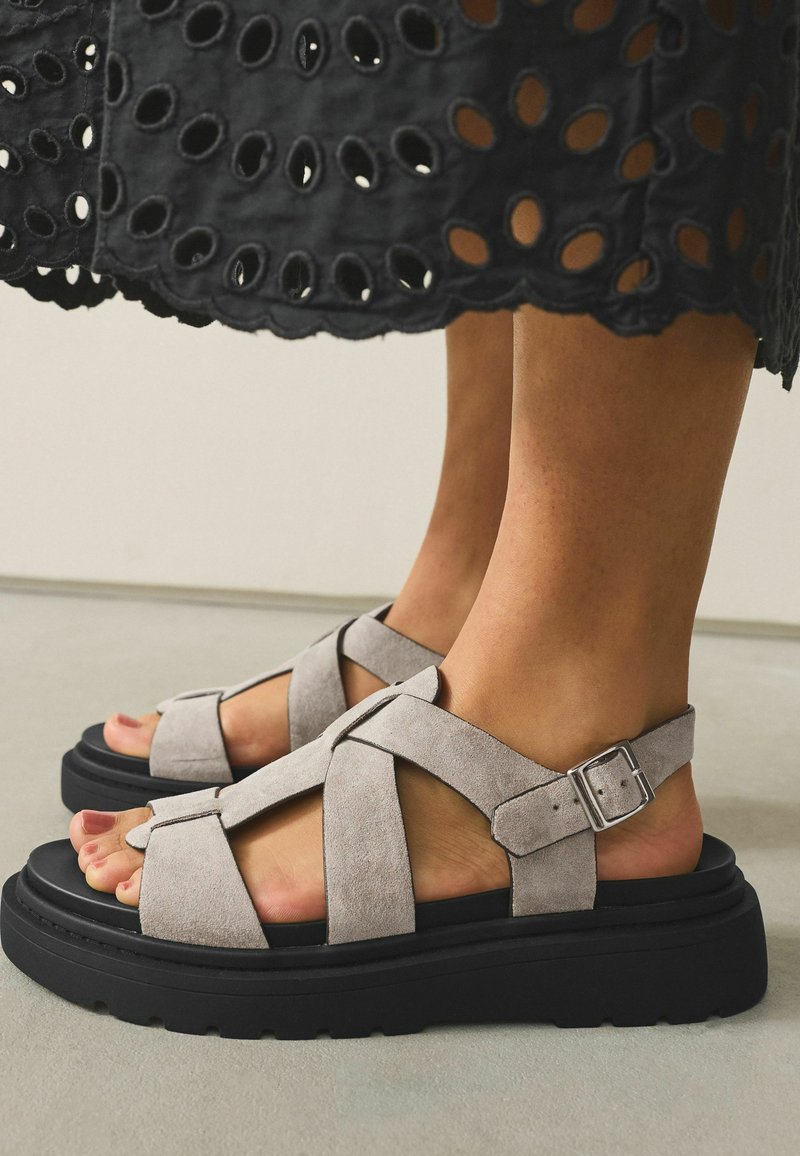 Sandales en daim gris à bretelles croisées, semelle épaisse noire et boucle réglable sur une sangle de cheville. Orteils exposés avec un vernis clair.