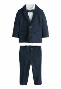 Jeune garçon portant une veste de smoking noire, une chemise blanche et un nœud papillon noir, regardant légèrement sur le côté sur un fond uni.