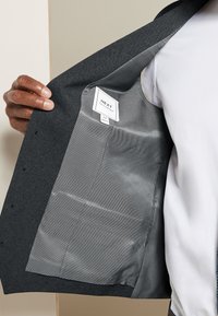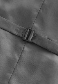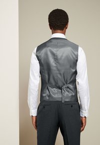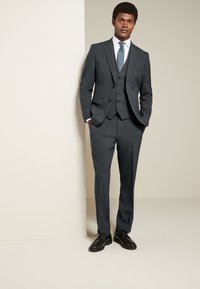 Homme aux cheveux courts et bouclés portant un gilet gris foncé, un pantalon assorti, une chemise blanche et une cravate bleue à motifs, debout, les mains dans les poches.