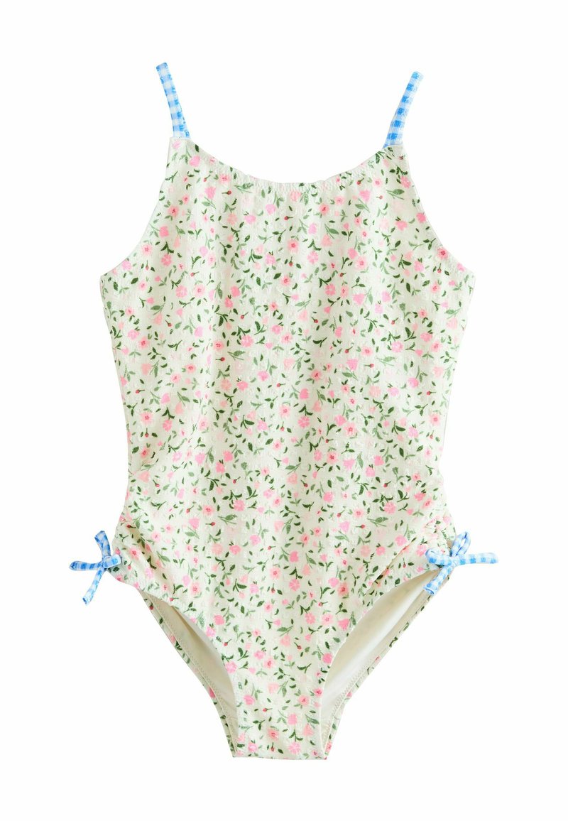 Maillot de bain une pièce avec un petit imprimé floral rose, bretelles en vichy bleu et nœuds assortis sur les côtés, sur fond blanc.