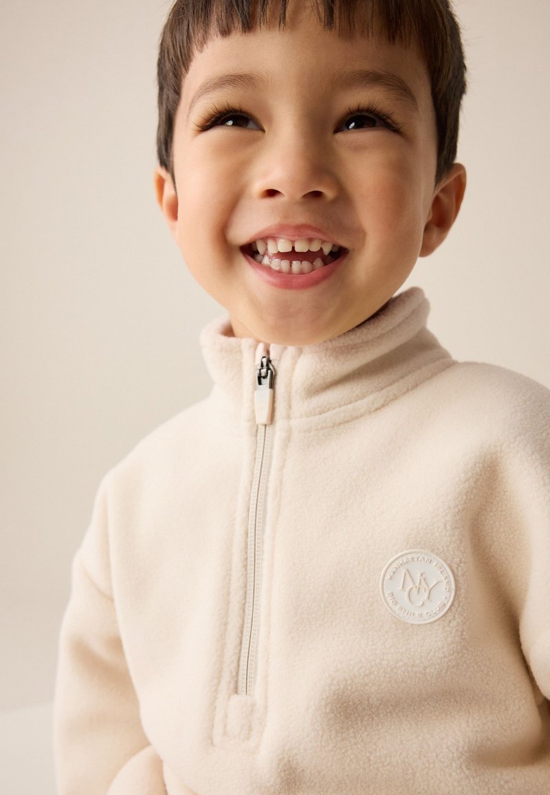 Jeune enfant souriant portant une veste en polaire couleur crème avec une fermeture éclair à moitié et un patch logo rond sur la poitrine, regardant vers le haut.
