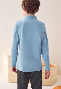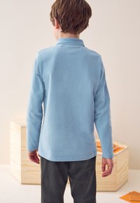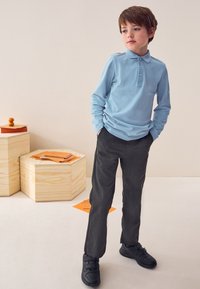 Garçon en polo à manches longues bleu clair et pantalon sombre, les mains dans les poches, debout près de caisses en bois contenant des dossiers orange sur un fond beige uni.
