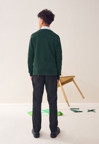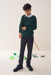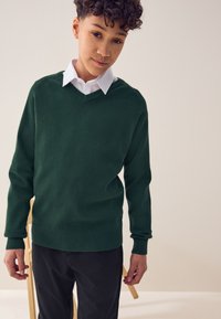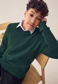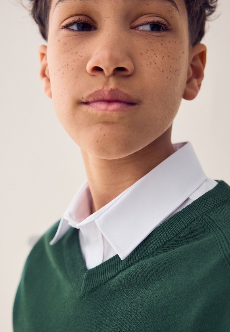 Jeune personne aux cheveux courts et bouclés avec des taches de rousseur, portant une chemise blanche à col sous un pull vert, regardant sur le côté.