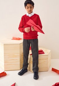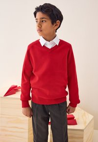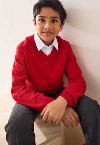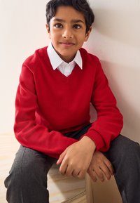 Enfant portant une chemise blanche à col sous un pull rouge en V, vu du menton à l'épaule sur un fond neutre.