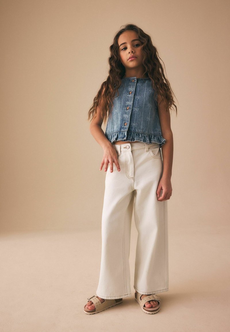 Jeune fille aux longs cheveux bouclés, portant un haut en jean sans manches, un pantalon large blanc et des sandales beige, debout devant un fond beige uni.