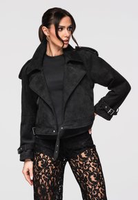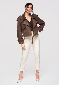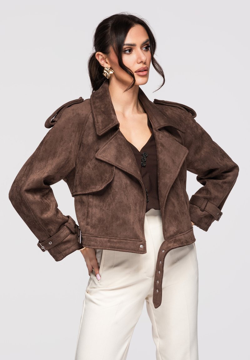 Femme portant une veste courte en daim marron avec un large col et des poignets ceinturés, associée à un pantalon blanc, posant les mains sur les hanches.