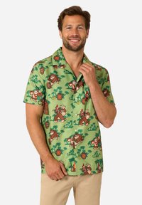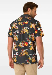 T-shirt noir à manches courtes avec un imprimé cartoon vibrant de Bowser et d'autres personnages dans des teintes orange, rouge et verte, avec une poche.
