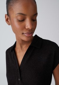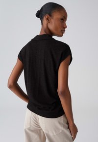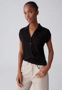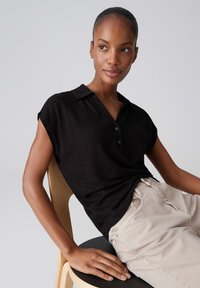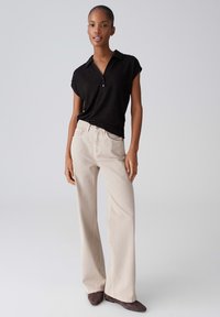 Femme portant un polo noir à manches courtes rentré dans un pantalon beige clair, debout avec une main dans la poche devant un fond uni.