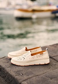 Mocassin beige clair à enfiler avec une semelle blanche épaisse, présenté en lévitation au-dessus d'un sol gris lisse avec un fond à rayures verticales.