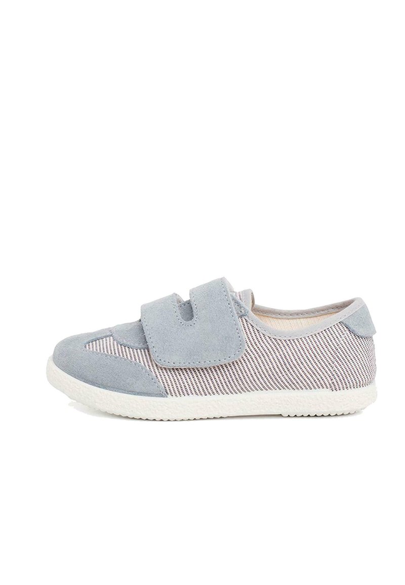 Baskets en suède gris et tissu rayé avec une sangle à velcro, dotées d'une semelle en caoutchouc blanc et d'une texture lisse sur le dessus.