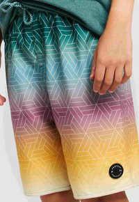 Shorts de bain à dégradé orange et vert avec taille élastique, cordon de serrage, poches latérales et une petite étiquette logo sur le côté gauche.