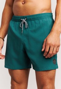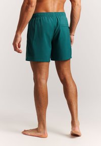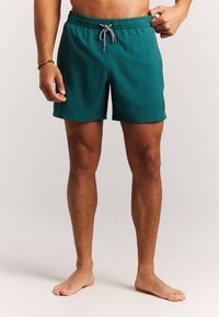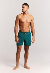 Homme portant un short de bain vert sarcelle avec un cordon noir et blanc, debout pieds nus devant un fond clair uni.