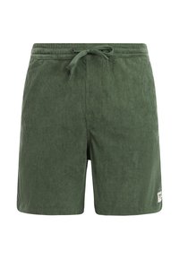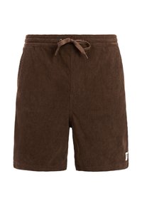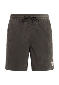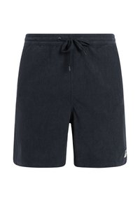 Shorts de bain bleu marine en tissu texturé, avec taille élastique, cordon de serrage et poches avant. Assortis à des tongs marron.