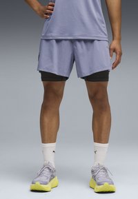 Homme portant un short de sport violet clair par-dessus un short de compression noir, des chaussettes blanches Puma et des baskets grises avec des semelles jaunes.