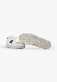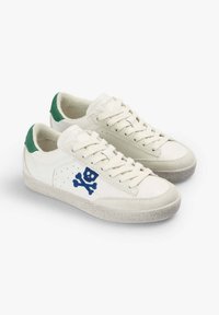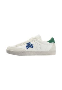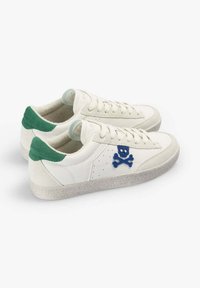 Baskets blanches basses avec une semelle texturée, logo bleu tête de mort et os croisés sur le côté, et languette de talon verte.