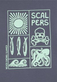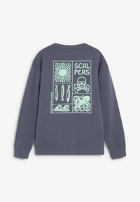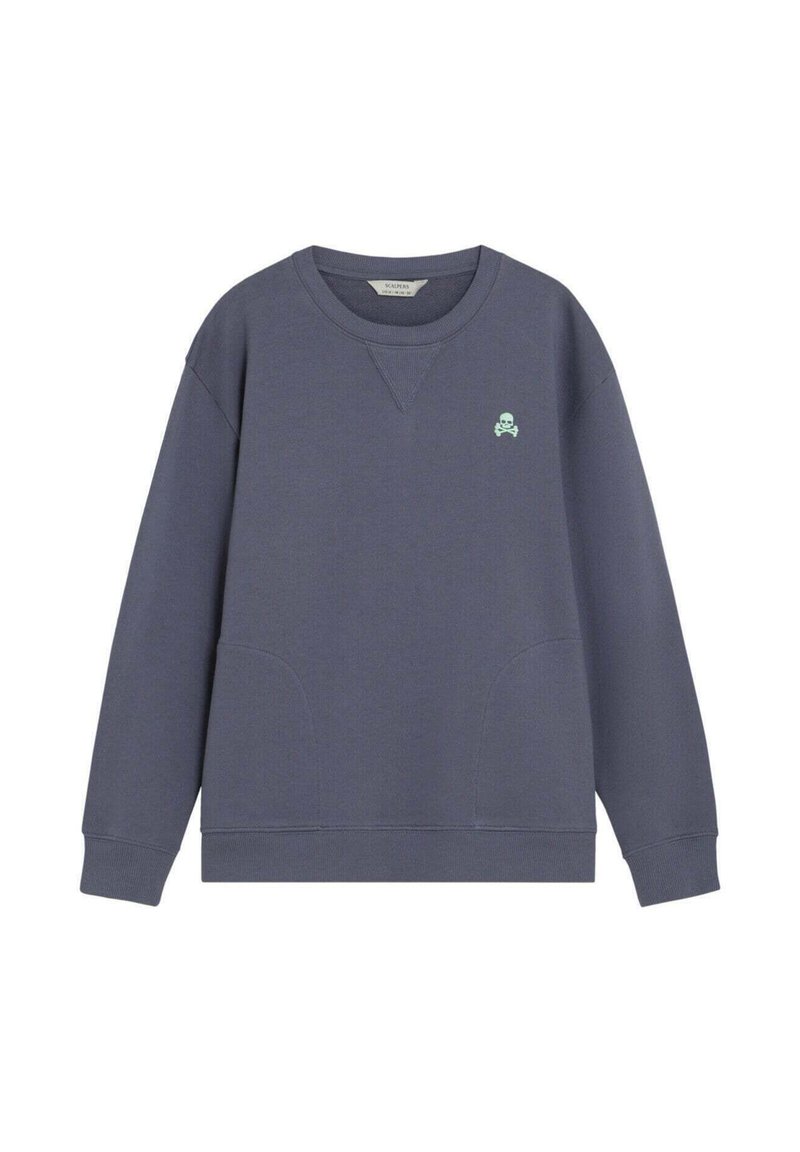 Sweat-shirt à col rond gris foncé avec manches longues, poignets côtelés, et un petit logo tête de mort et os croisés vert clair sur la poitrine gauche.