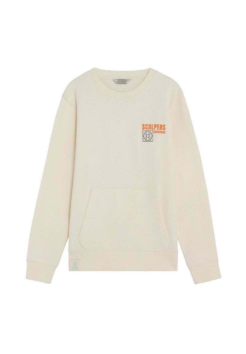 Sweat-shirt de couleur crème avec poche à rabat à l'avant et petit logo orange "Scalpers Showroom" au-dessus d'un motif sur le côté gauche de la poitrine.