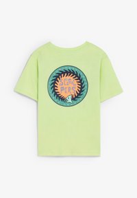 T-shirt vert clair à manches courtes et col rond, avec un petit logo noir de tête de mort et os croisés sur le côté gauche de la poitrine.