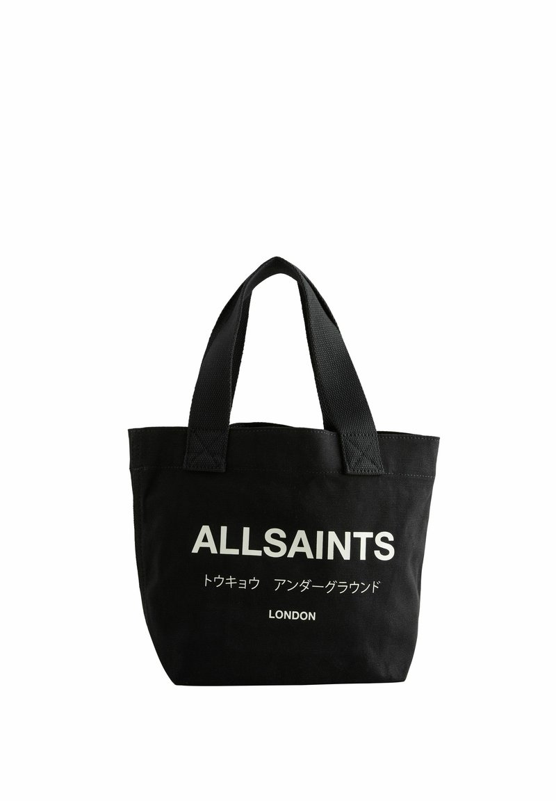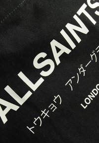 Sac fourre-tout en toile noire avec double poignée. Le devant présente un texte imprimé en blanc : "ALLSAINTS", des caractères japonais, et "LONDON" en bas.