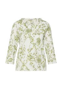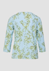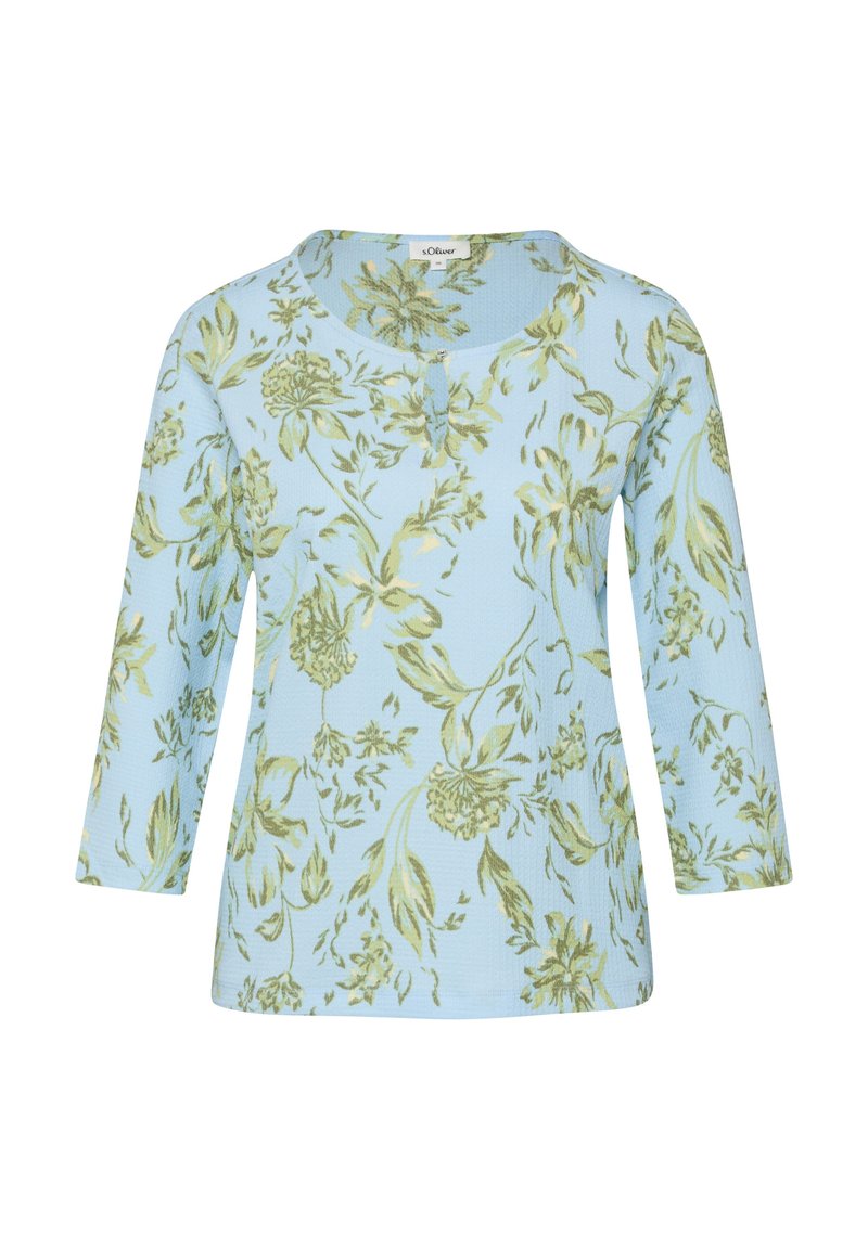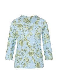 Chemise bleu clair à manches longues avec un motif floral vert et un col rond comportant un petit détail en forme de fente à l'avant.