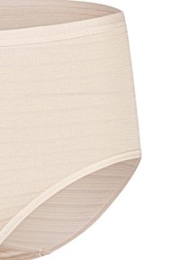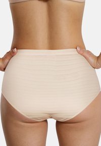 Vue de dos d'une personne portant des sous-vêtements beiges sans coutures taille haute, les mains posées sur les hanches, mettant en valeur la texture lisse du tissu.