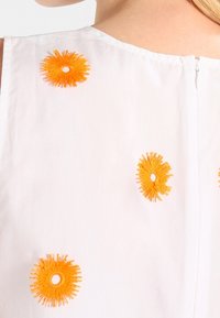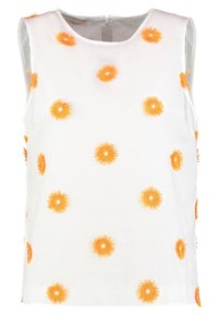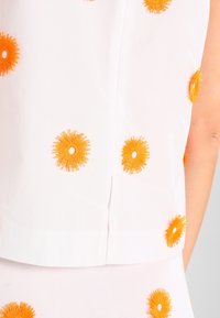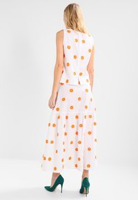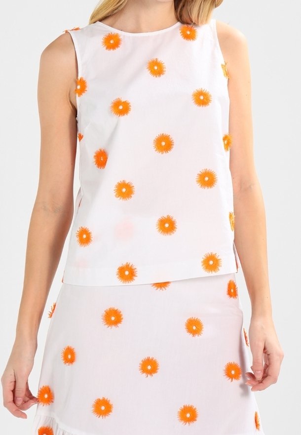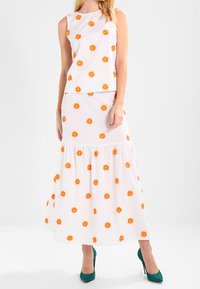 Ensemble composé d'un haut sans manches blanc et d'une jupe avec des motifs floraux orange vif, porté par une personne debout sur un fond uni.