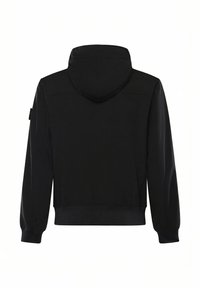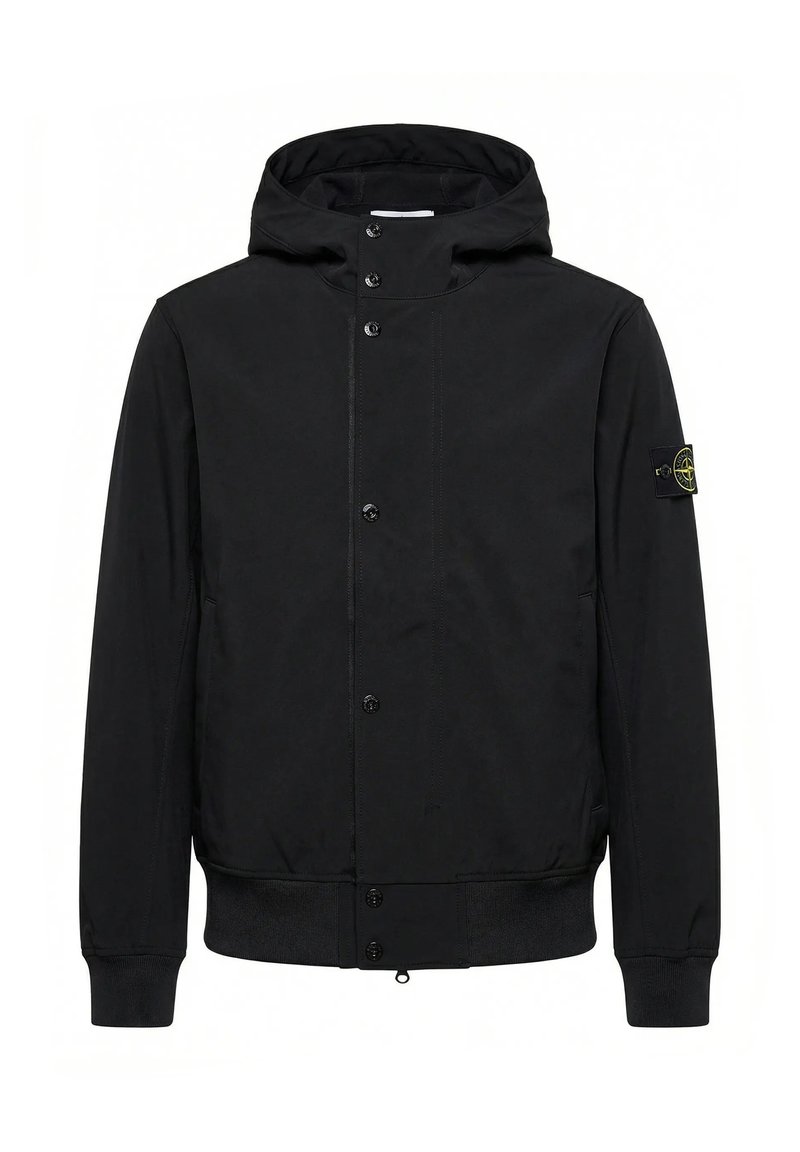 Veste noire à capuche avec boutons-pression à l'avant, poignets et ourlet côtelés, et un patch logo sur la manche gauche.