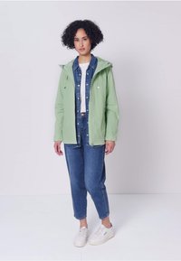 Femme aux cheveux bouclés portant une veste à capuche vert clair par-dessus une chemise en jean bleue et un jean, debout les mains dans les poches devant un fond uni.