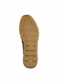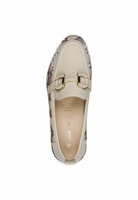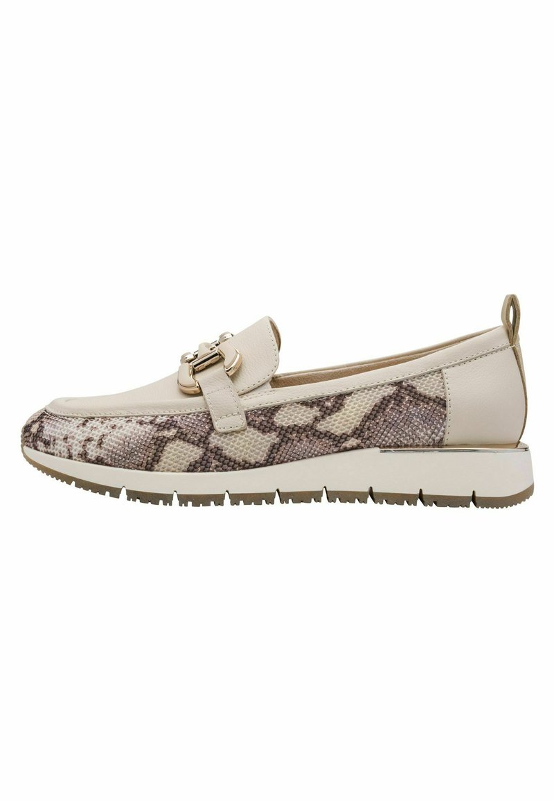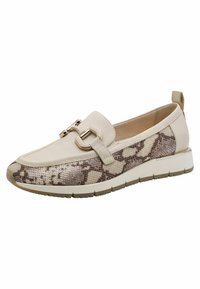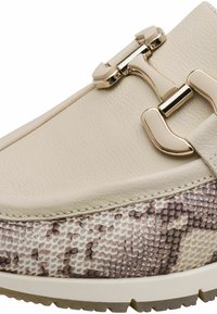 Chaussure beige à enfiler présentant un panneau en imprimé serpent texturé, des détails métalliques dorés et une semelle en caoutchouc blanche avec un motif de bande de roulement pour une meilleure adhérence.