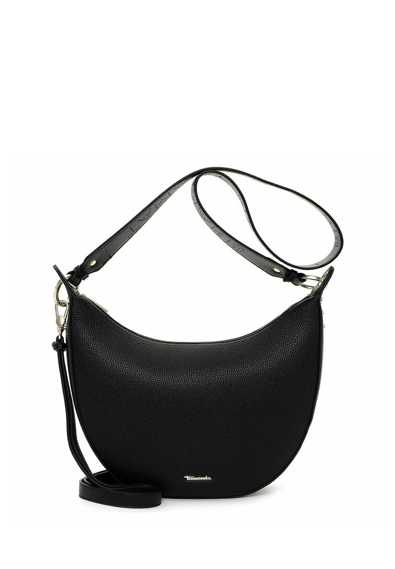 Sac à bandoulière en cuir noir avec une forme incurvée, une surface texturée, une sangle ajustable et un petit logo métallique. Fermeture à glissière sur le dessus.