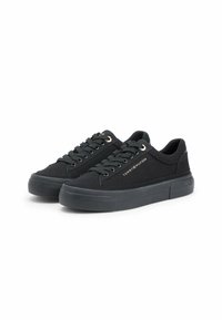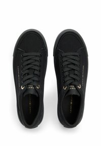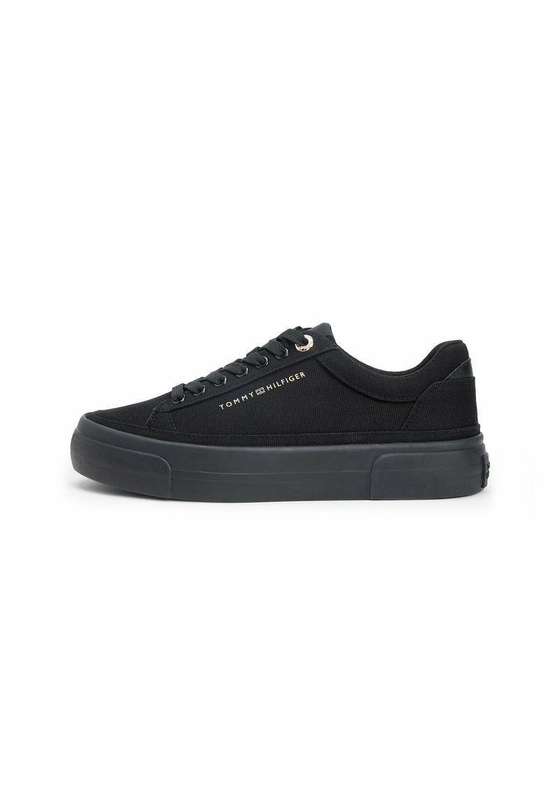 Baskets basses noires avec une semelle épaisse, une tige en tissu, une fermeture à lacets et le logo "Tommy Hilfiger" sur le côté.