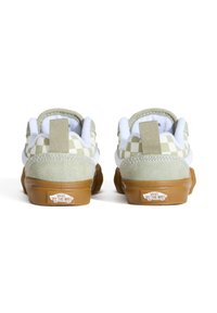 Chaussures de skateboard à carreaux verts et blancs avec une semelle en caoutchouc, des lacets blancs et une languette de tirage à l'arrière. Tissu texturé avec des accents en suède.