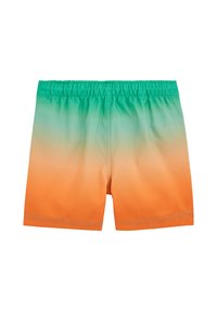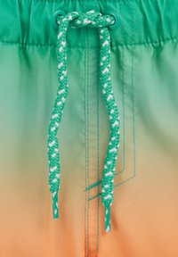 Shorts de bain à dégradé orange et vert avec taille élastique, cordon de serrage, poches latérales et une petite étiquette logo sur le côté gauche.