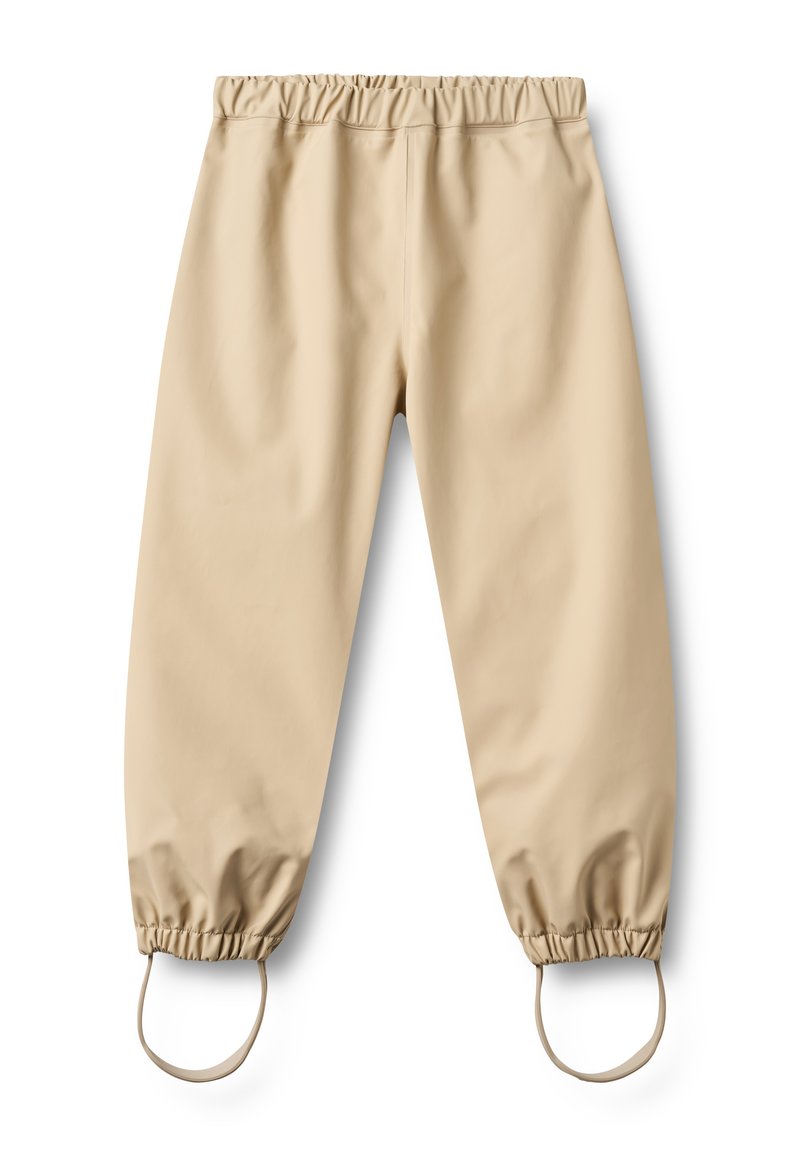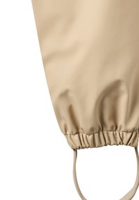 Pantalon imperméable beige avec taille élastique et bords de chevilles munis de sangles pour les pieds, conçu pour la protection en extérieur ou par temps de pluie.