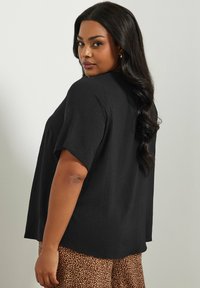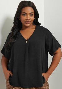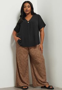 Femme aux longs cheveux foncés portant un chemisier noir à col en V avec un seul bouton et un pantalon marron à motifs, debout les mains dans les poches.
